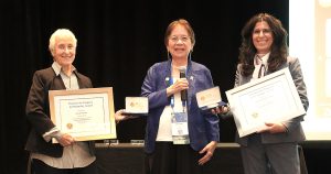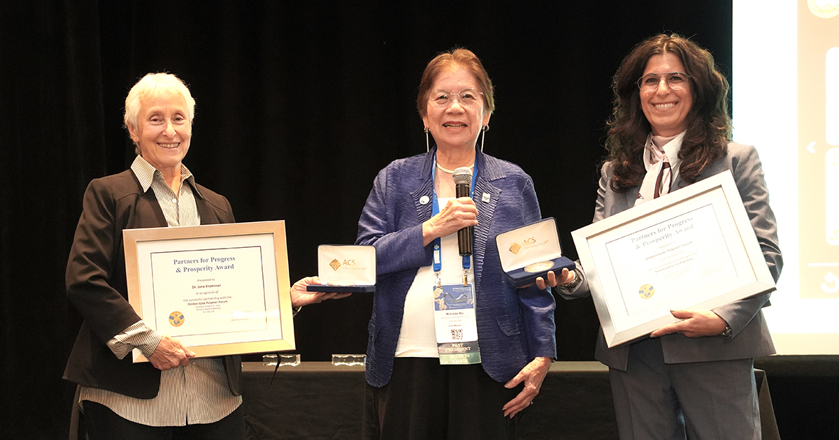 Marinda Wu, a past president of the ACS and the creator of this award (center), presents the P3 award to Jane Frommer (representing SVACS, left) and Mikki Larner (representing GGPF, right)